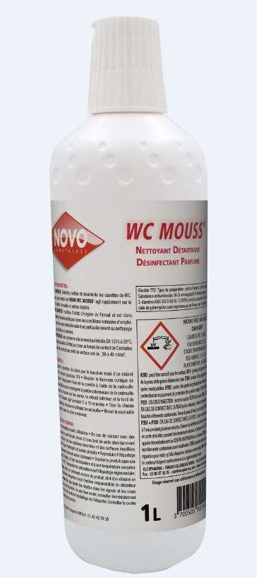 NOVO WC MOUSS’ détartre, nettoie et désinfecte les cuvettes de WC. La mousse super active agit rapidement sur le calcaire, le tartre, la rouille et d’autres dépôts.Il restitue l’éclat d’origine de l’émail et est sans danger pour les fosses septiques dans les conditions normales d’emploi.L’utilisation avec une vadrouille aide tout particulièrement au nettoyage soigné des toilettes et urinoirs