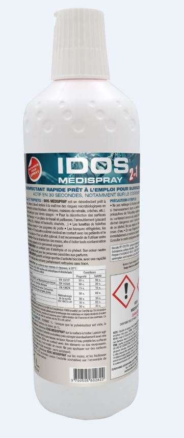 IDOS MEDISPRAY est un désinfectant prêt à l’emploi à base d’alcool destiné à la maîtrise des risques microbiologiques en environnement médical (hôpitaux, cliniques, maisons de retraite, crèches, etc.). Il a été développé pour divers usages.
