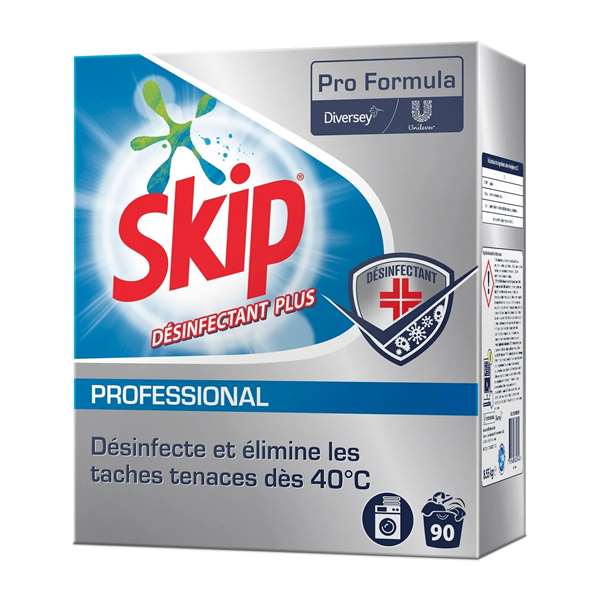 Skip Disinfectant Plus Professional est un détergent enzymatique sans phosphate pour la désinfection termochimique. Il peut être appliqué à toutes les duretés de l'eau et convient au lavage de tous les tissus blancs en coton et en polycoton et des articles de couleur. Grâce à son mélange efficace de tensioactifs, le produit est excellent sur une large gamme de taches telles que les taches grasses/d'huile, de sang, et alimentaires. Il contient un système de blanchiment à moyenne température pour préserver la blancheur du linge et prévenir le grisaillement. De plus, les séquestrants de dureté de l'eau présents dans la formule empêchent la corrosion des pièces de machines. Le produit possède de fortes propriétés désinfectantes.